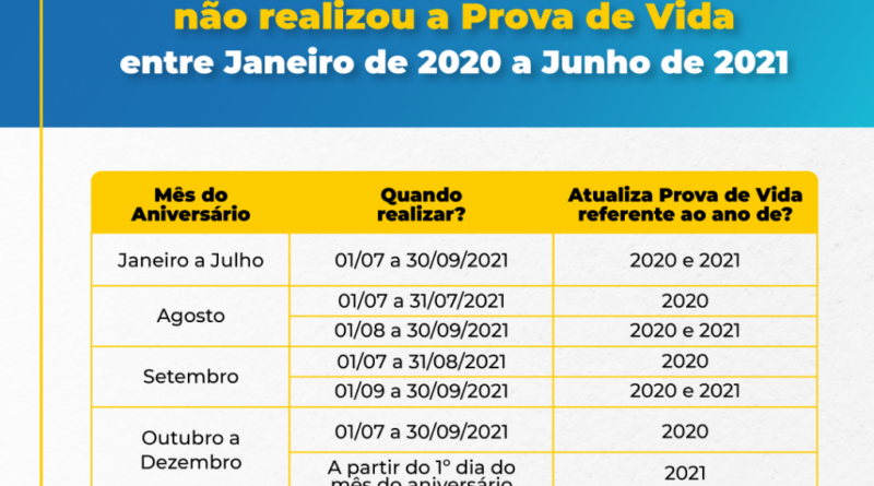 Lembramos que a realização da Prova de Vida voltou a ser exigida. Caso não tenha realizado a comprovação durante o período de suspensão, você tem até o dia 30 de setembro de 2021 para realizar a Prova de Vida referente ao ano de 2020 e ao período de janeiro a junho de 2021.